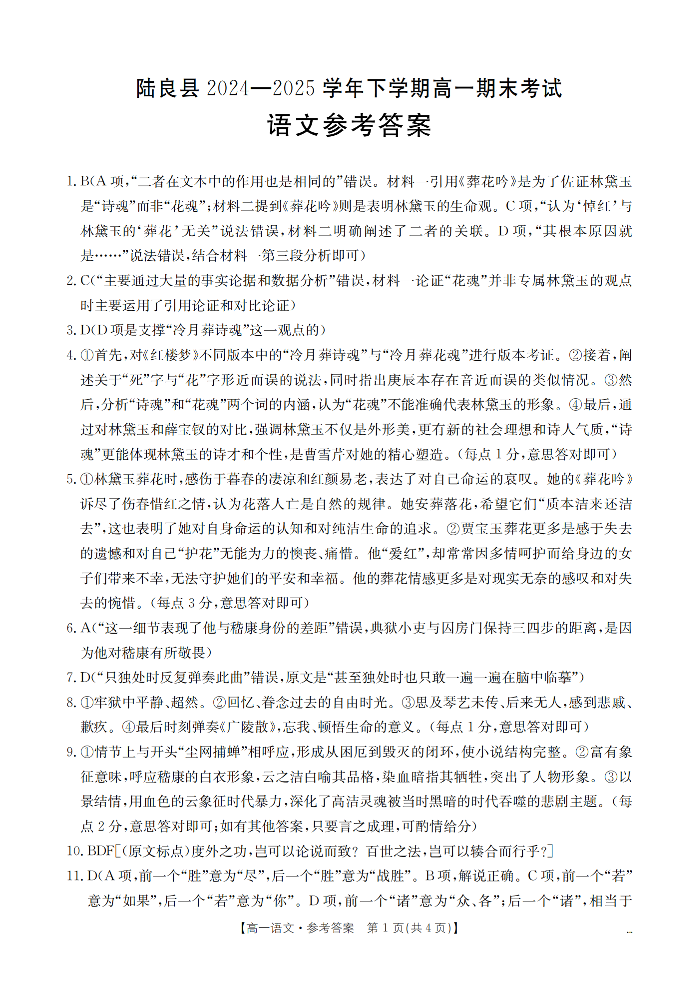 高一语文答案--云南省曲靖市陆良县2024-2025学年高一下学期期末考试