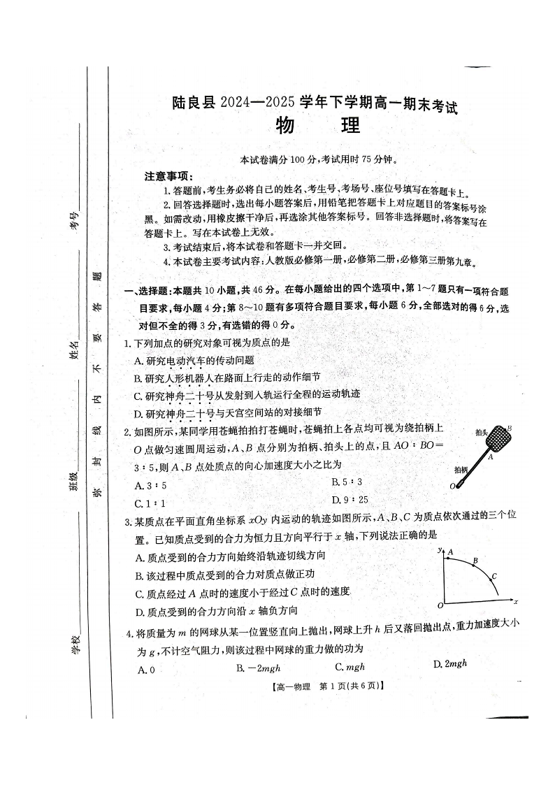 高一物理--云南省曲靖市陆良县2024-2025学年高一下学期期末考试