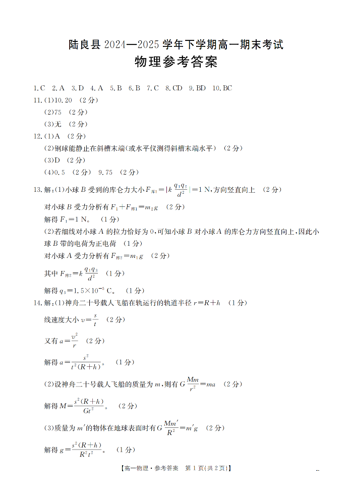 高一物理答案--云南省曲靖市陆良县2024-2025学年高一下学期期末考试