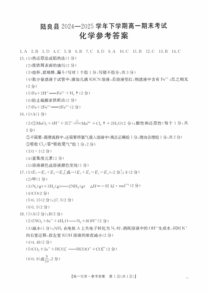 高一化学答案--云南省曲靖市陆良县2024-2025学年高一下学期期末考试