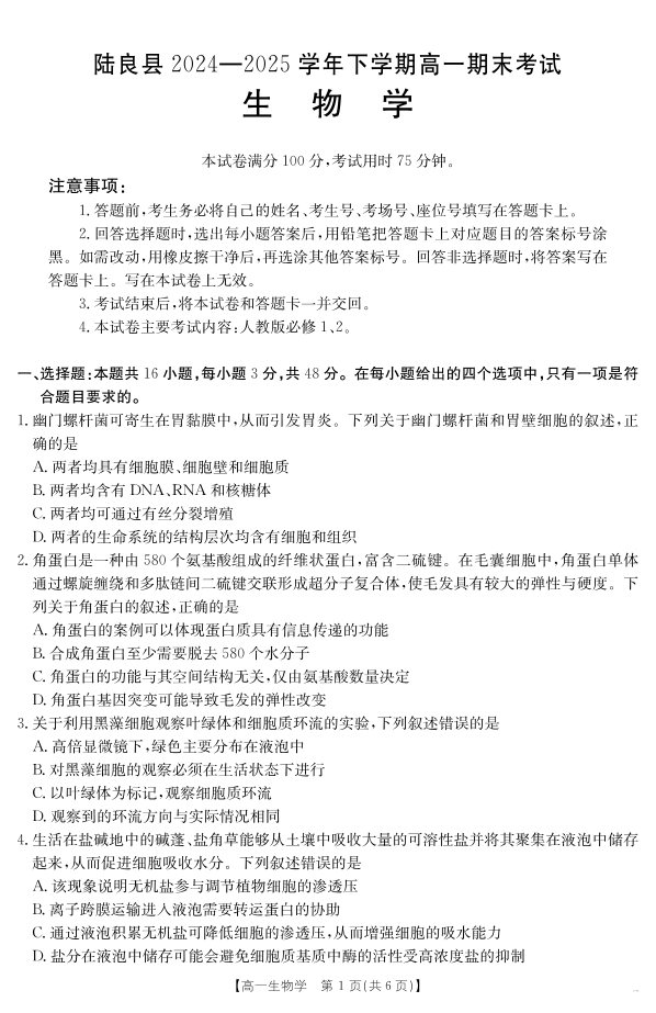 高一生物--云南省曲靖市陆良县2024-2025学年高一下学期期末考试