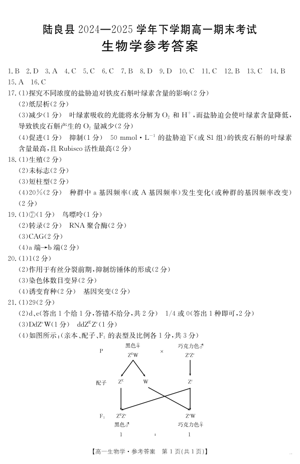 高一生物答案--云南省曲靖市陆良县2024-2025学年高一下学期期末考试