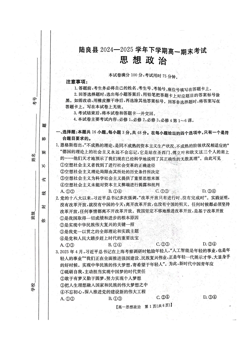 高一政治--云南省曲靖市陆良县2024-2025学年高一下学期期末考试