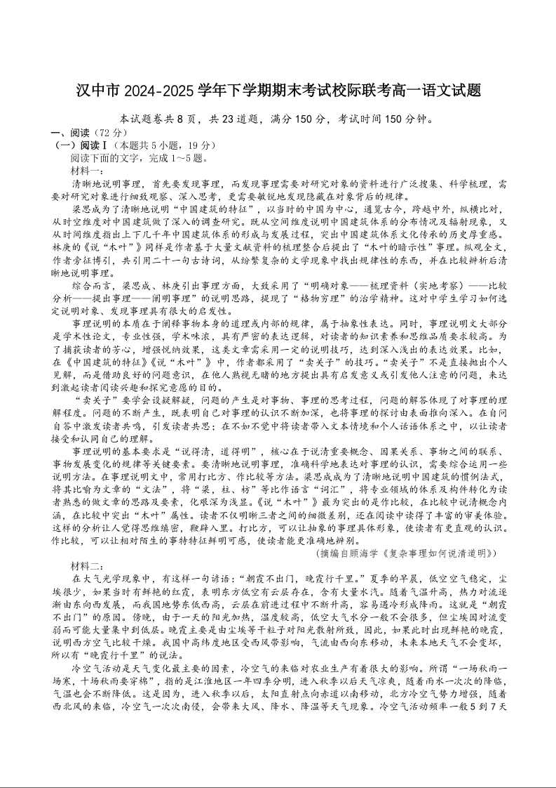 高一语文+答案--陕西省汉中市2024-2025学年高一下学期期末校际联考