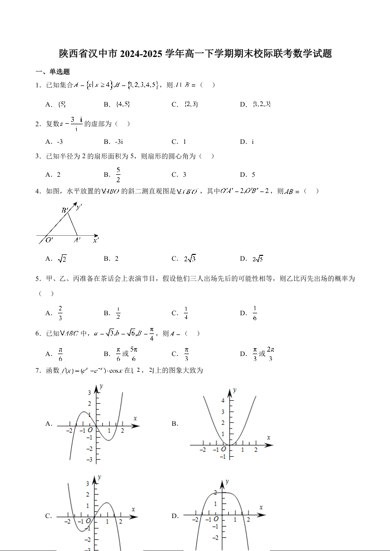 高一数学+答案--陕西省汉中市2024-2025学年高一下学期期末校际联考