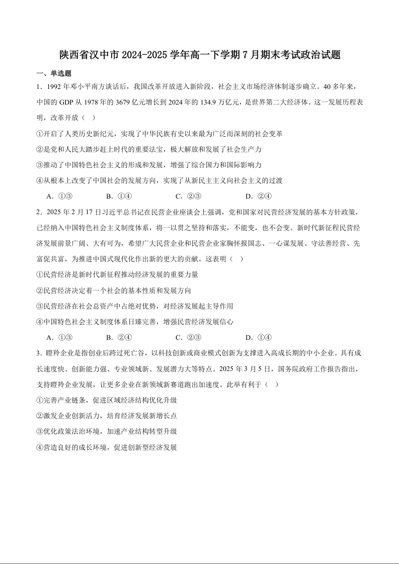 高一政治+答案--陕西省汉中市2024-2025学年高一下学期期末校际联考