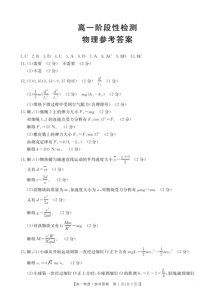 高一物理答案--甘肃省天水市2024-2025学年高一下学期期末阶段性检测