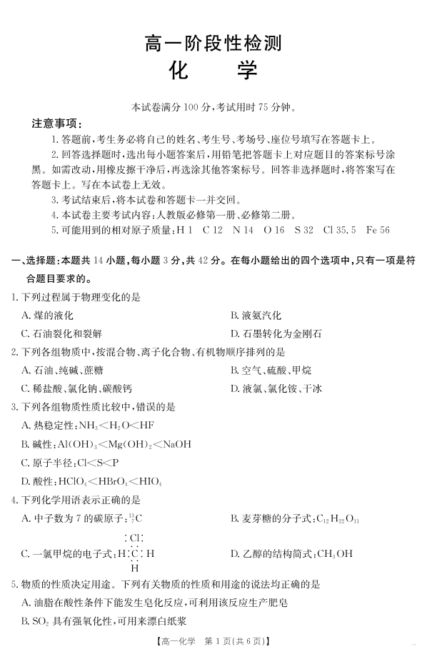 高一化学--甘肃省天水市2024-2025学年高一下学期期末阶段性检测