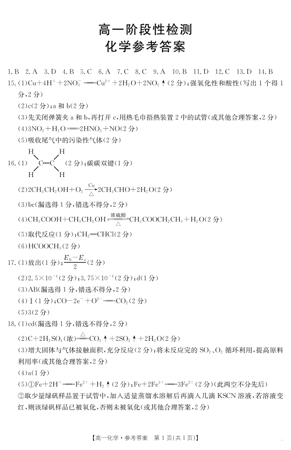 高一化学答案--甘肃省天水市2024-2025学年高一下学期期末阶段性检测