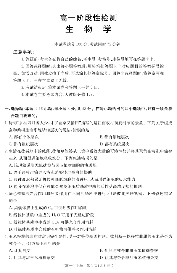 高一生物--甘肃省天水市2024-2025学年高一下学期期末阶段性检测