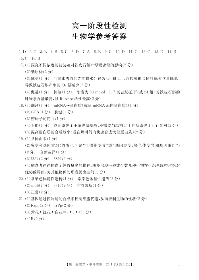 高一生物答案--甘肃省天水市2024-2025学年高一下学期期末阶段性检测