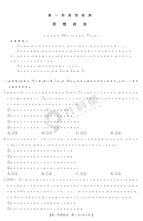 高一政治--甘肃省天水市2024-2025学年高一下学期期末阶段性检测