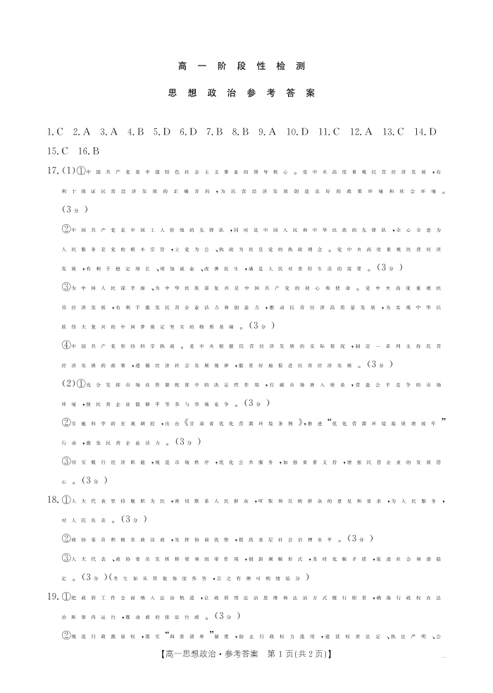 高一政治答案--甘肃省天水市2024-2025学年高一下学期期末阶段性检测
