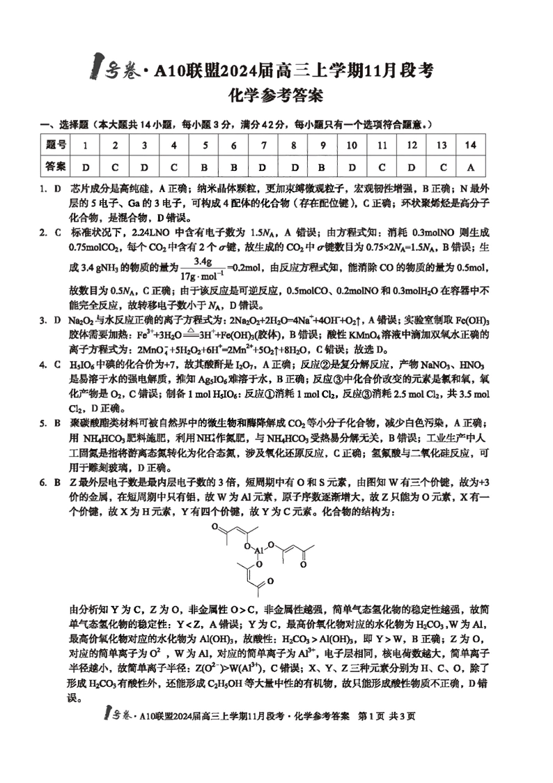 安徽省A10联盟2024届高三上学期11月段考化学答案