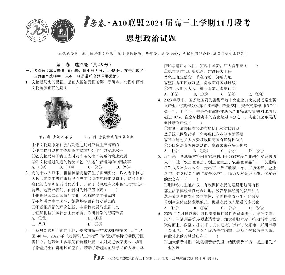 安徽省A10联盟2024届高三上学期11月段考思想政治