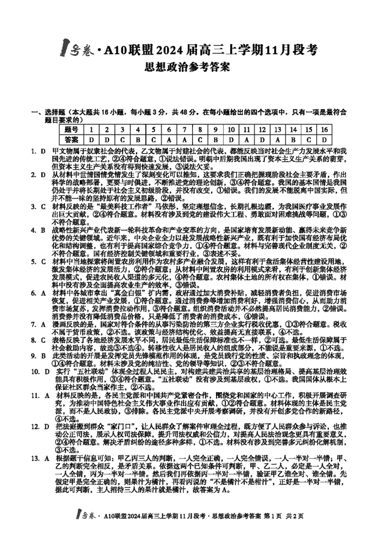 安徽省A10联盟2024届高三上学期11月段考思想政治答案