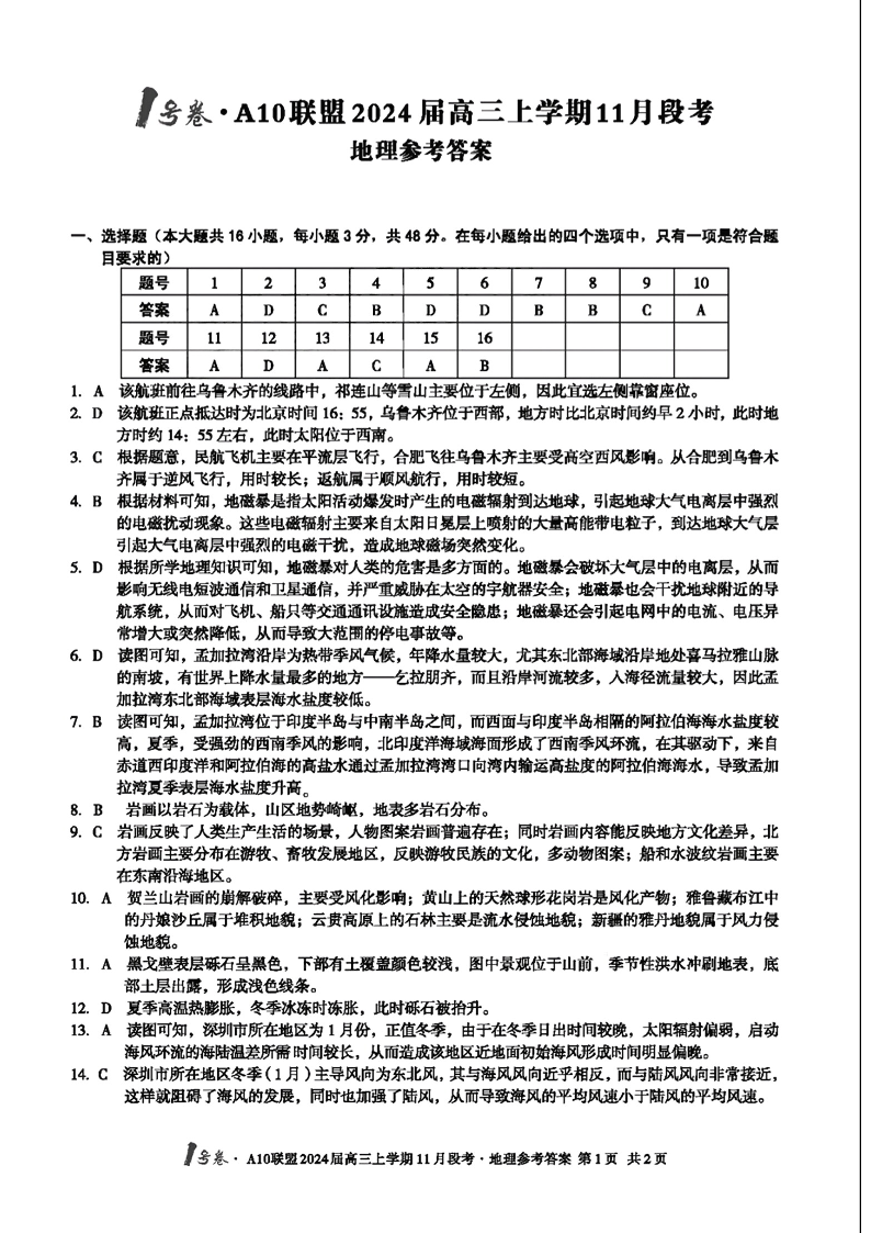 安徽省A10联盟2024届高三上学期11月段考地理答案