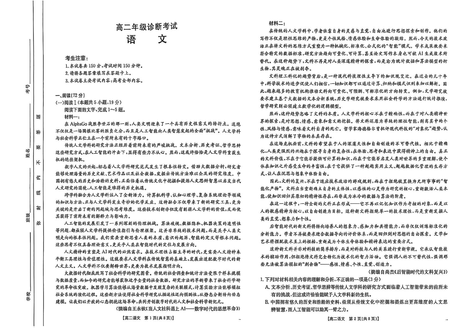 高二语文--甘肃省庆阳市2024-2025学年高二下学期期末诊断