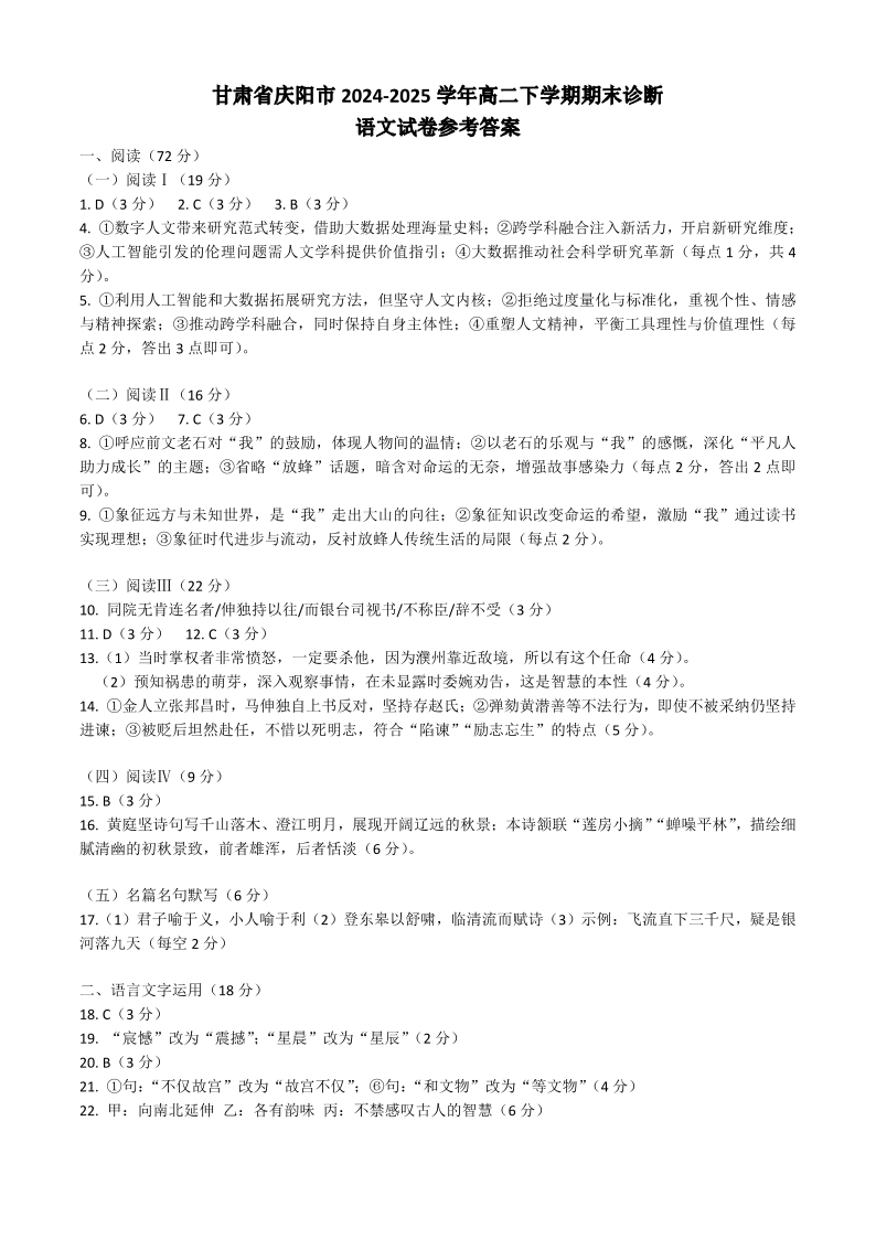 高二语文答案--甘肃省庆阳市2024-2025学年高二下学期期末诊断
