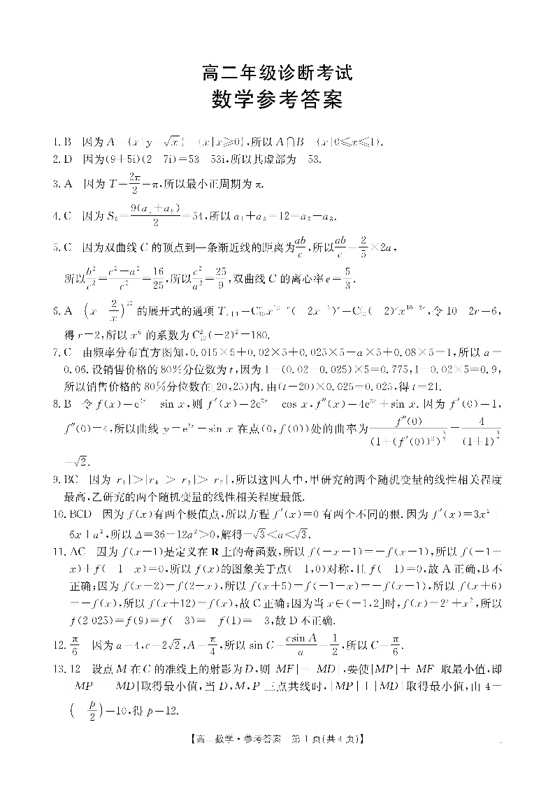 高二数学答案--甘肃省庆阳市2024-2025学年高二下学期期末诊断