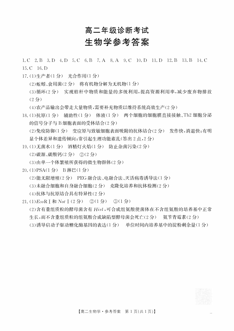 高二生物答案--甘肃省庆阳市2024-2025学年高二下学期期末诊断