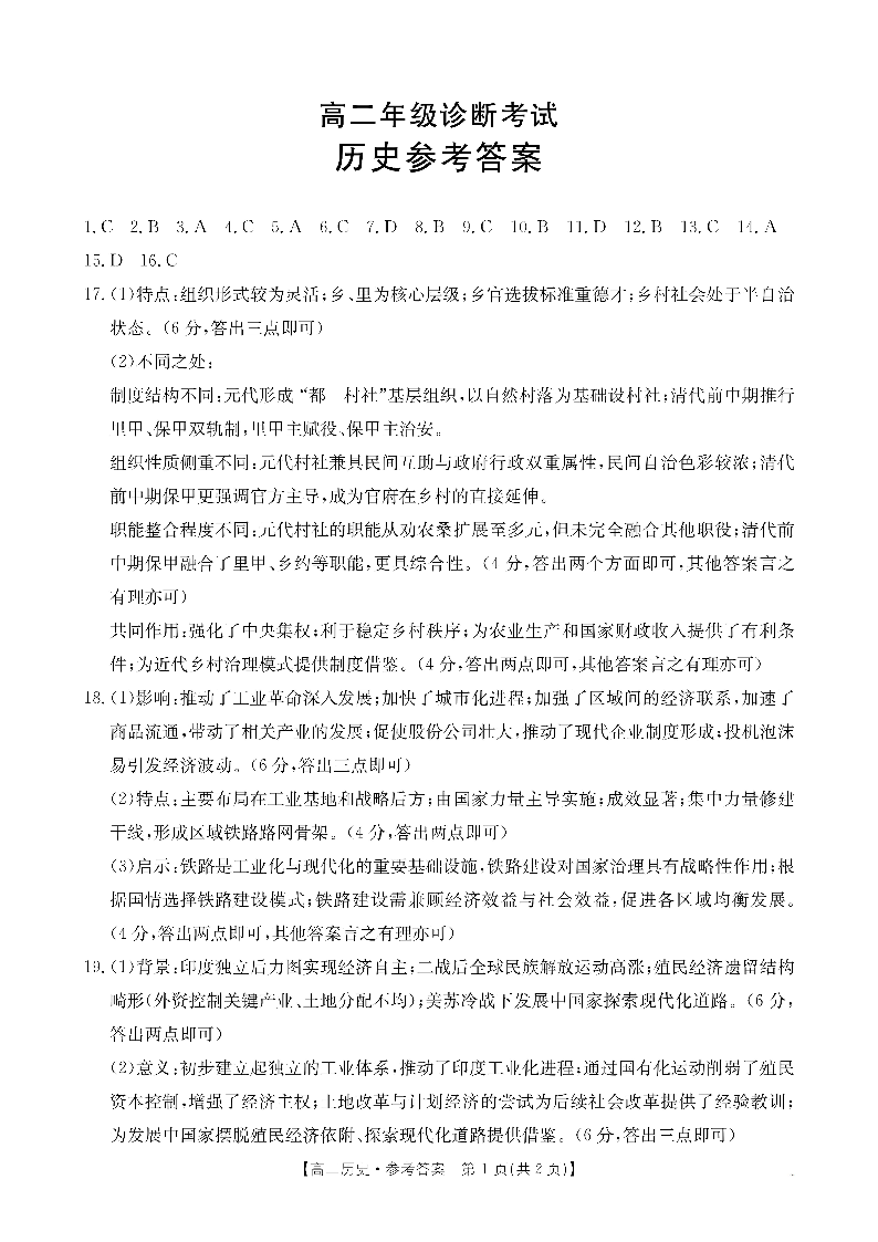 高二历史答案--甘肃省庆阳市2024-2025学年高二下学期期末诊断