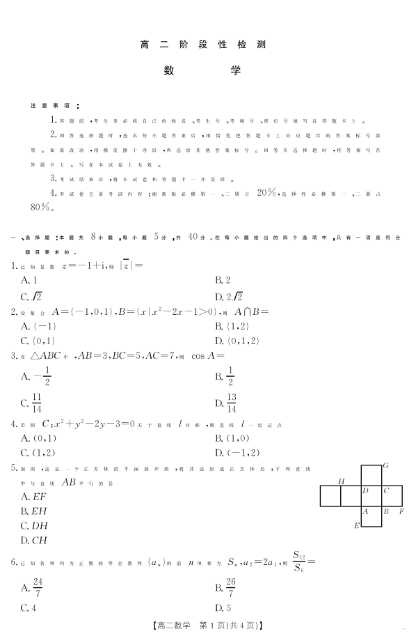 高二数学--甘肃省天水市2024-2025学年高二下学期期末阶段性检测