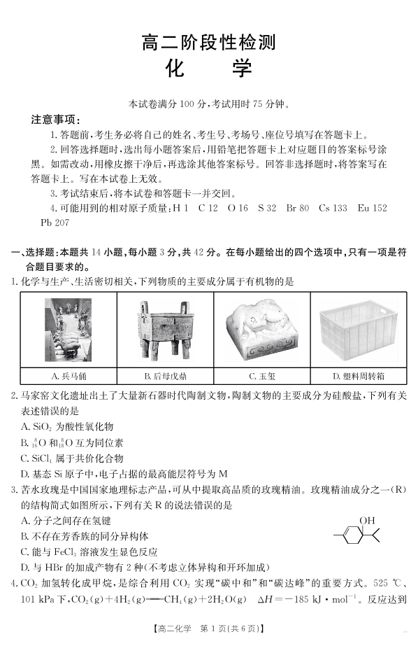 高二化学--甘肃省天水市2024-2025学年高二下学期期末阶段性检测