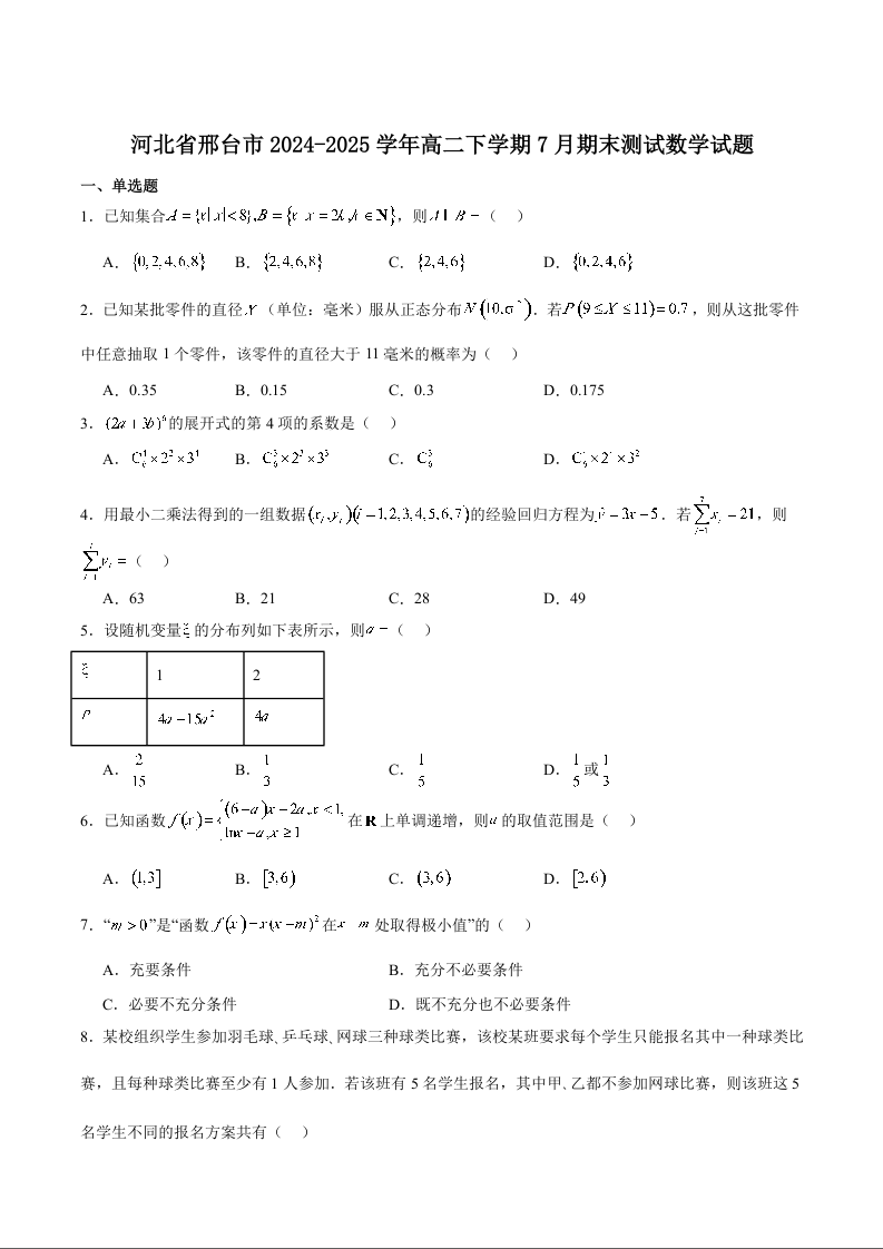 高二数学+答案--河北省邢台市2024-2025学年高二下学期7月金太阳期末测试