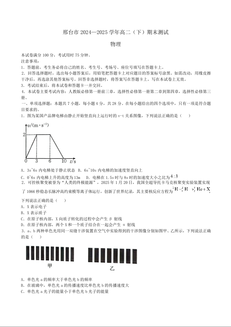 高二物理+答案--河北省邢台市2024-2025学年高二下学期7月金太阳期末测试