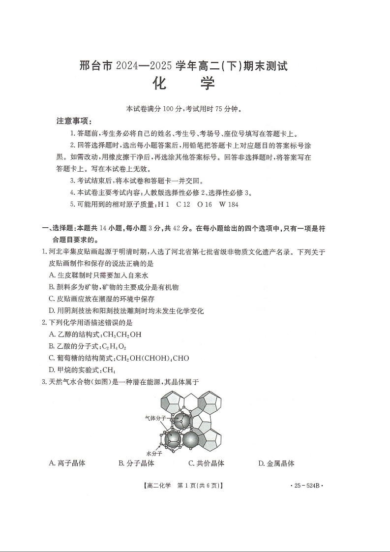 高二化学--河北省邢台市2024-2025学年高二下学期7月金太阳期末测试