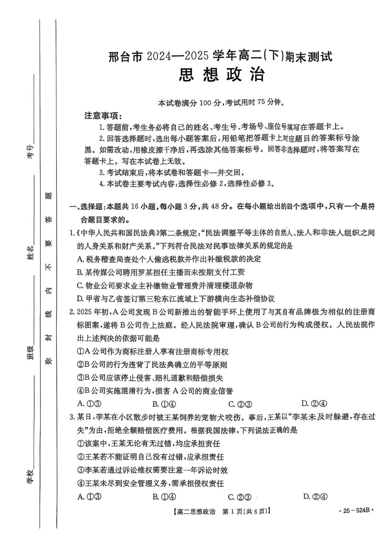 高二政治+答案--河北省邢台市2024-2025学年高二下学期7月金太阳期末测试
