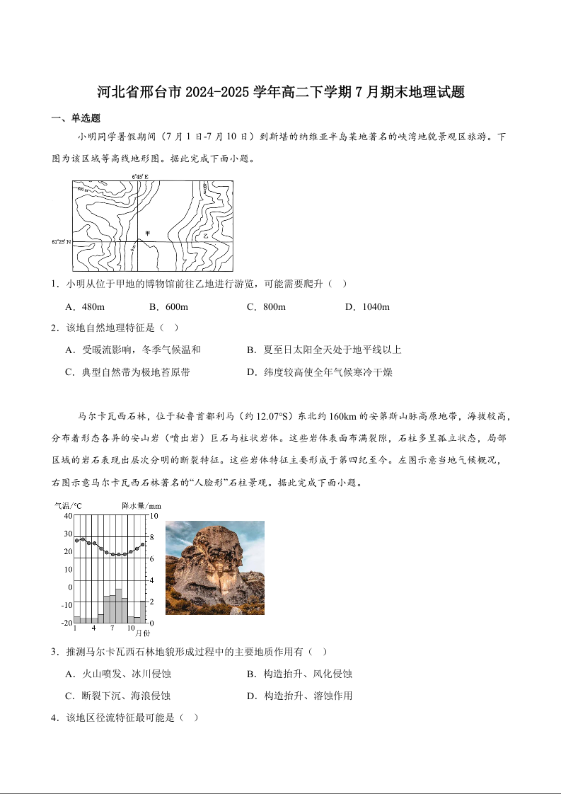 高二地理+答案--河北省邢台市2024-2025学年高二下学期7月金太阳期末测试