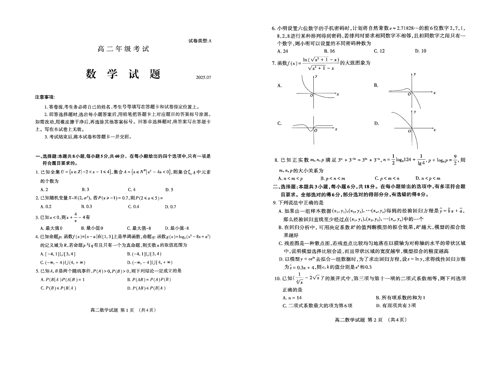 高二数学+答案--山东省泰安市2024-2025学年高二下学期7月期末考试