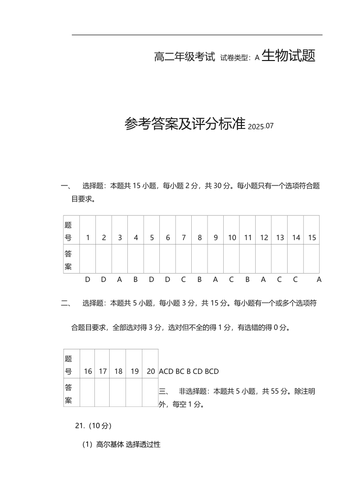 高二生物答案--山东省泰安市2024-2025学年高二下学期7月期末考试