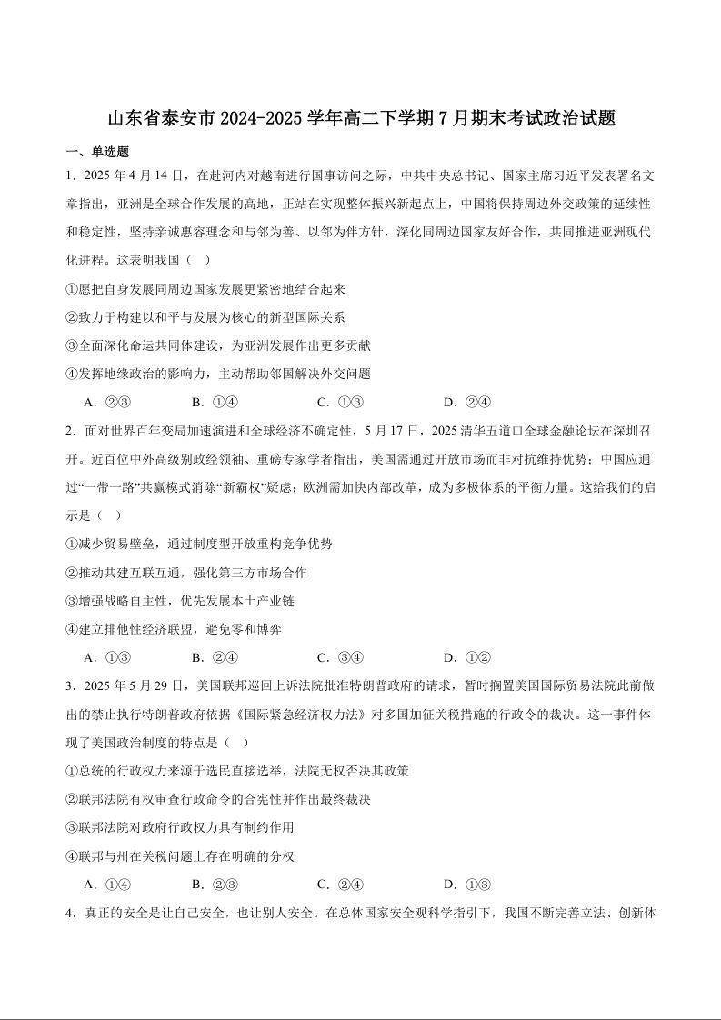 高二政治+答案--山东省泰安市2024-2025学年高二下学期7月期末考试
