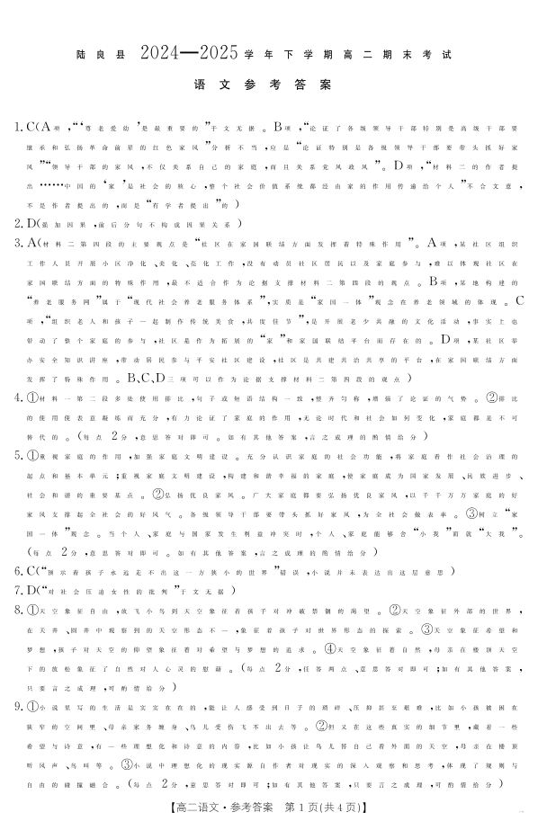 高二语文答案--云南省曲靖市陆良县2024-2025学年高二下学期期末考试