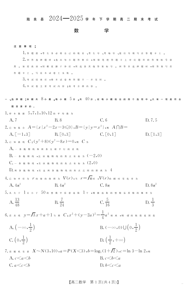 高二数学--云南省曲靖市陆良县2024-2025学年高二下学期期末考试
