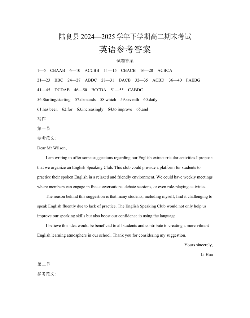 高二英语答案--云南省曲靖市陆良县2024-2025学年高二下学期期末考试