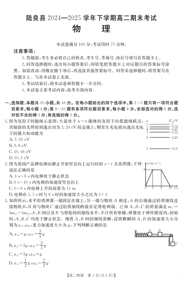 高二物理--云南省曲靖市陆良县2024-2025学年高二下学期期末考试