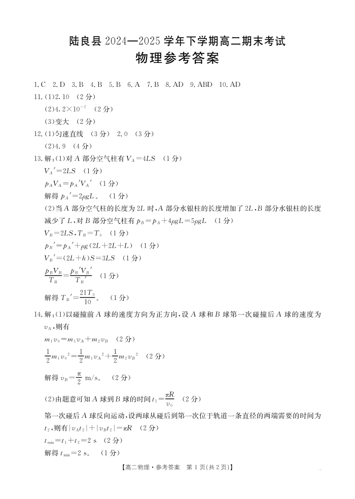 高二物理答案--云南省曲靖市陆良县2024-2025学年高二下学期期末考试