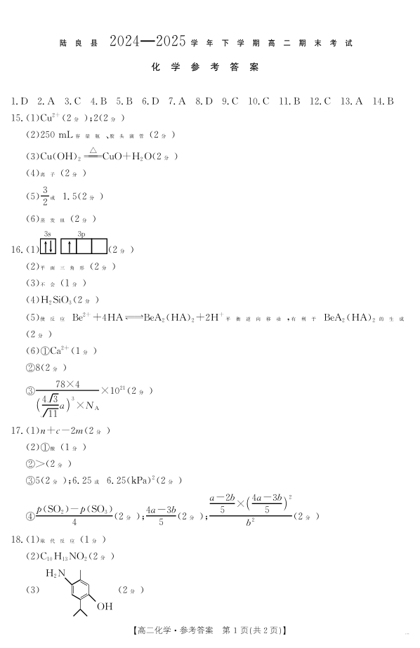 高二化学答案--云南省曲靖市陆良县2024-2025学年高二下学期期末考试