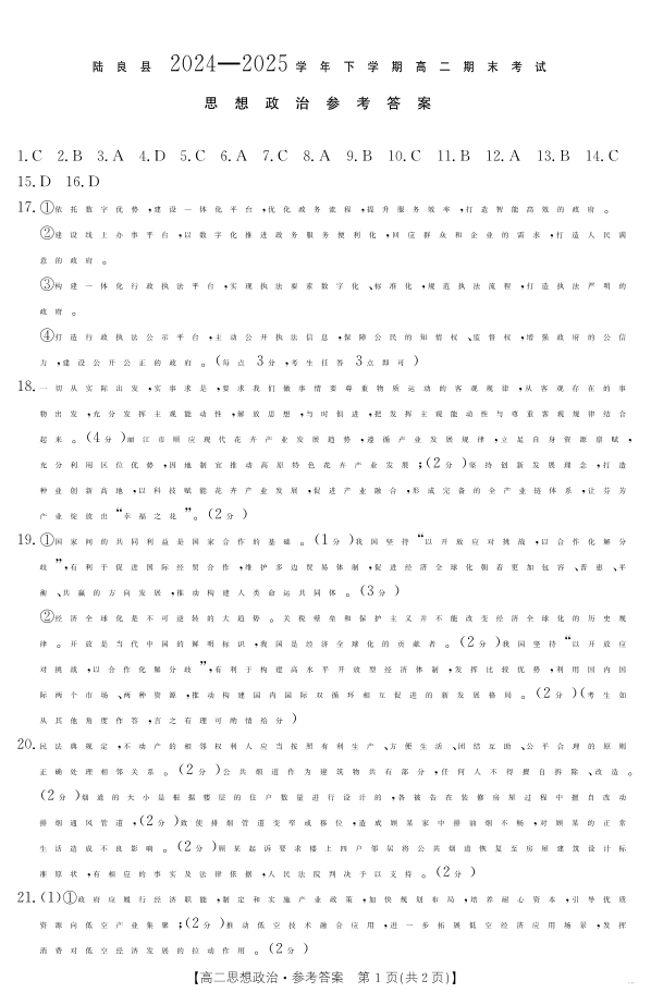 高二政治答案--云南省曲靖市陆良县2024-2025学年高二下学期期末考试