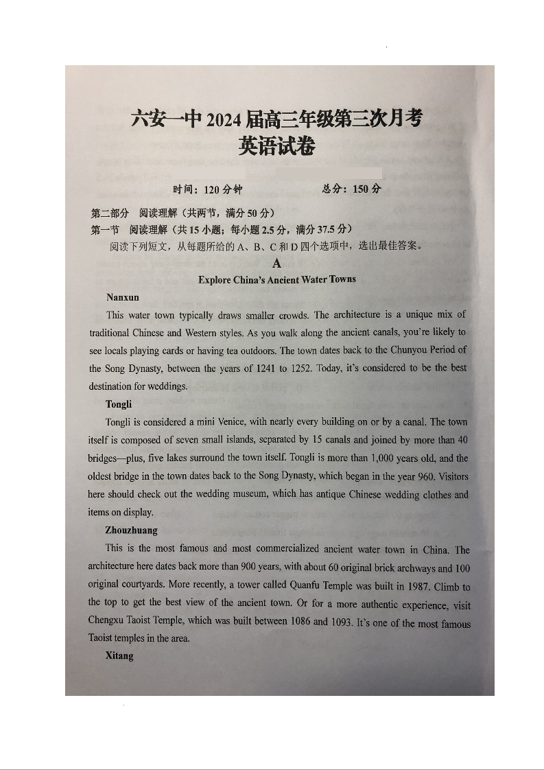 安徽省六安市第一中学2024届高三上学期第三次月考英语+答案