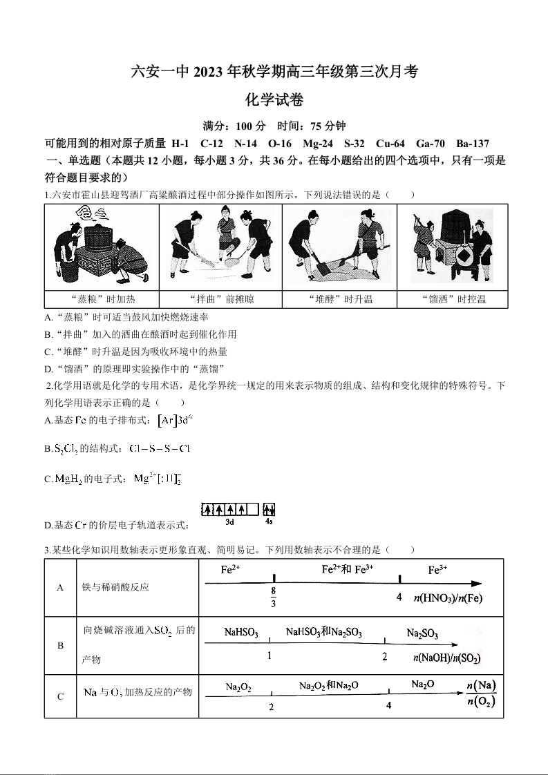 安徽省六安市第一中学2024届高三上学期第三次月考化学