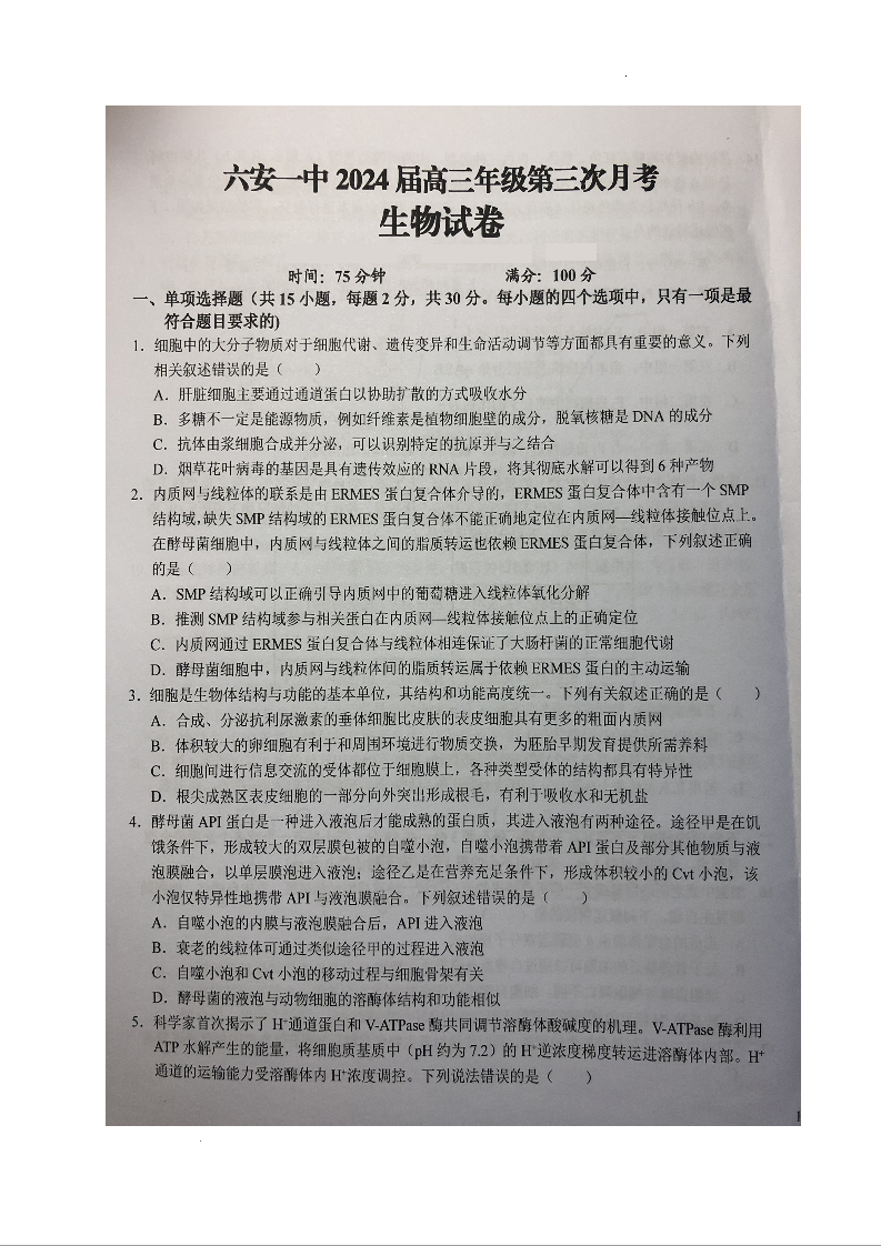 安徽省六安市第一中学2024届高三上学期第三次月考生物+答案