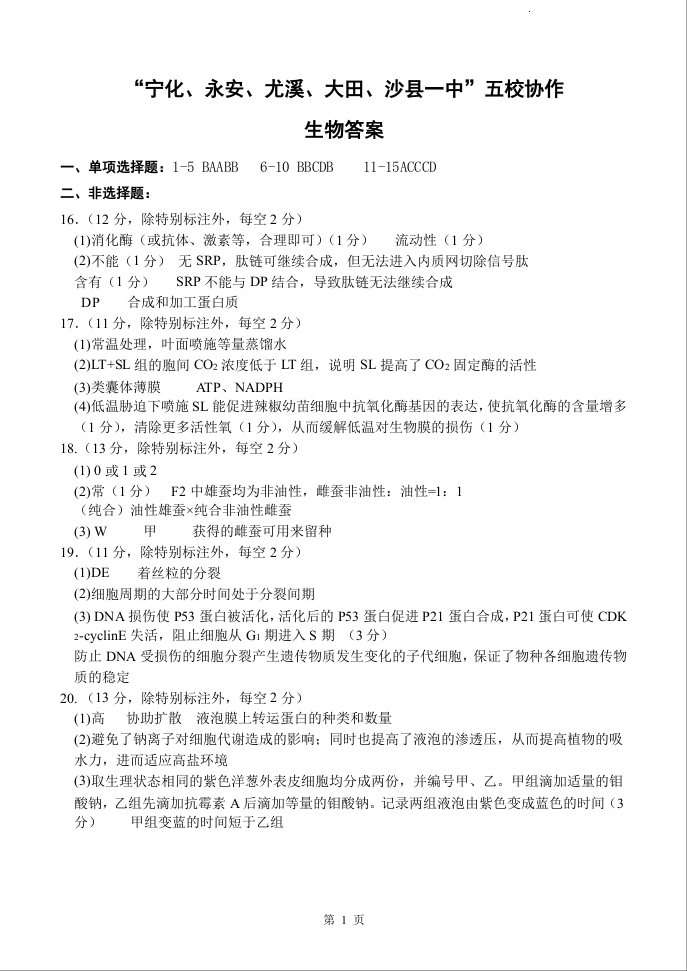 福建省2024届高三上学期五校协作期中联考生物答案