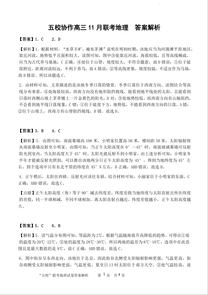 福建省2024届高三上学期五校协作期中联考地理答案