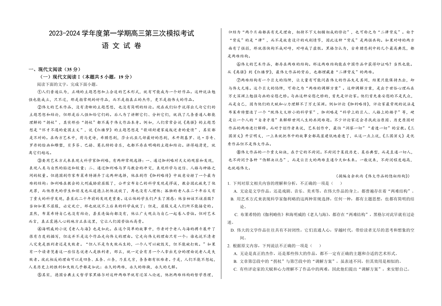 甘肃省武威市凉州区2024届高三上学期第三次诊断考试语文