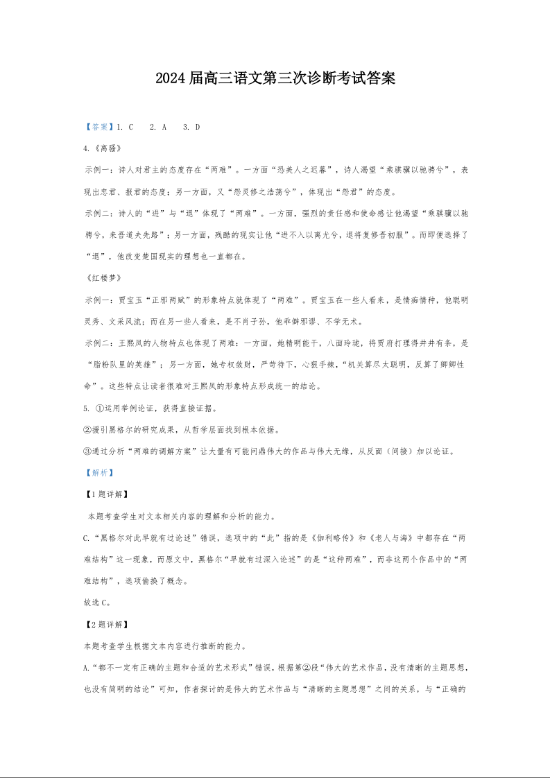 甘肃省武威市凉州区2024届高三上学期第三次诊断考试语文答案